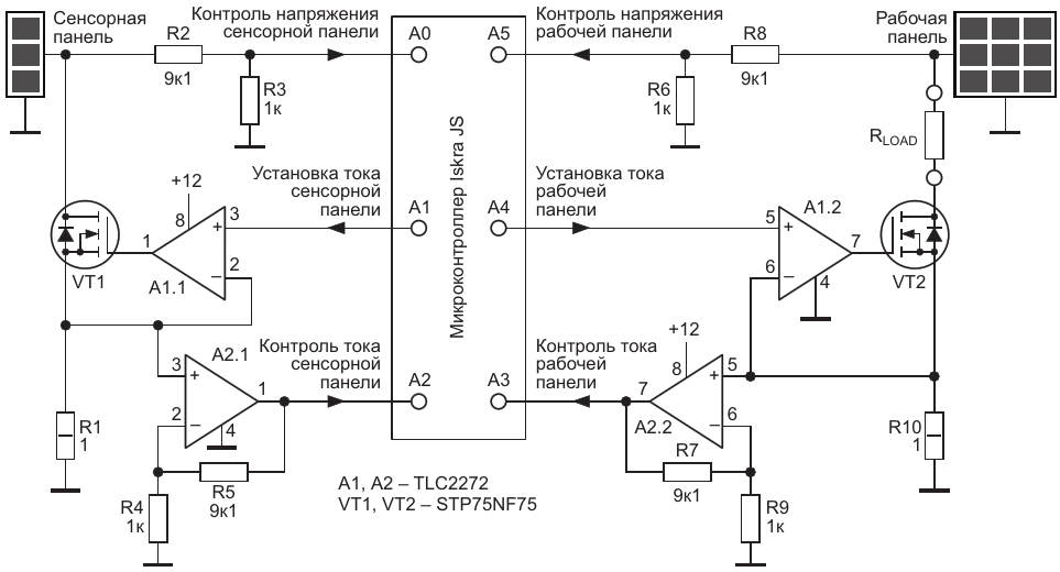 Рисунок 2. Блок-схема экспериментальной системы, поддерживающей работу солнечной панели в точке максимальной мощности