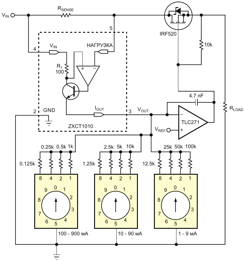 Пропускание тока через MOSFET и стабилизация его с помощью микросхемы датчика тока позволяют обойти BCD-переключатели, чтобы увеличить ток нагрузки