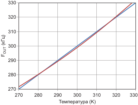 Рисунок 3. Зависимость выходной частоты схемы Рисунок 1 от абсолютной температуры T