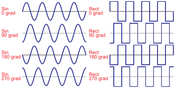 Форма четырехфазных сигналов на выходах генератора синусоидальных сигналов и выходах формирователей сигналов прямоугольной формы
