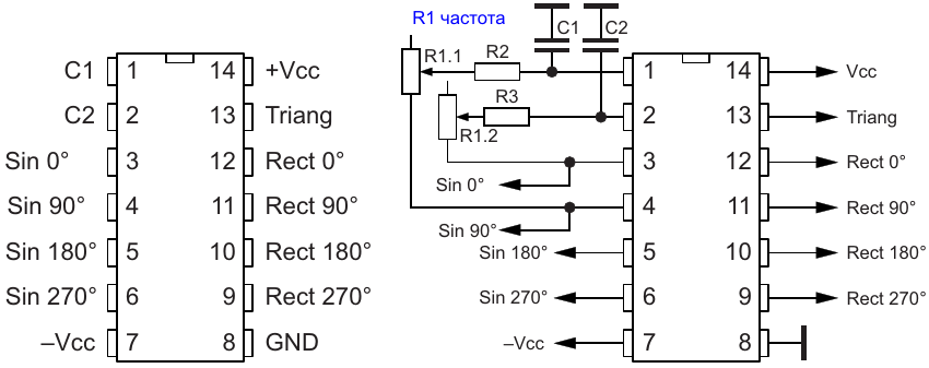 Рисунок 5. Возможная цоколевка микросхемы четырехфазного функционального генератора и схема ее включения