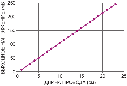 Выходное напряжение системы для различных длин медного провода сечением 0.82 мм2, измеренное в лаборатории, показывает, что сопротивление равно 213.58 мкОм/см