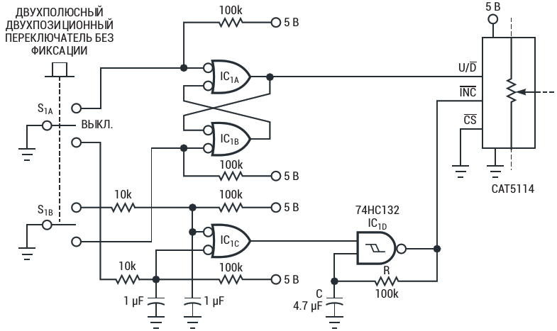 Однополюсный переключатель управляет цифровым потенциометром