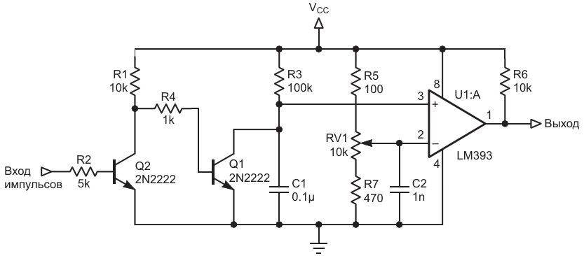 Схема обнаруживает длинные импульсы, ширина которых задается потенциометром RV1. На выход будут проходить только длинные импульсы, а остальные, короткие, - нет