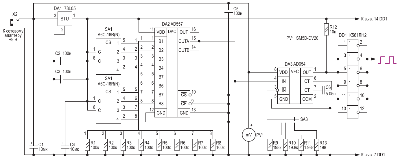 Рисунок 1. Низкочастотный генератор импульсов с дискретной установкой частоты (вариант 1)