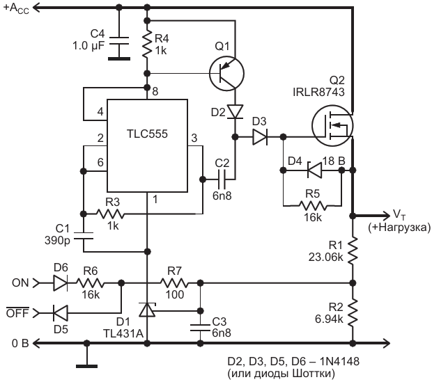 Схема рассчитана на свинцовый аккумулятор напряжением 12 В с гелевым электролитом при температуре 20 °C. Для аккумуляторов другого типа может потребоваться изменение номиналов компонентов