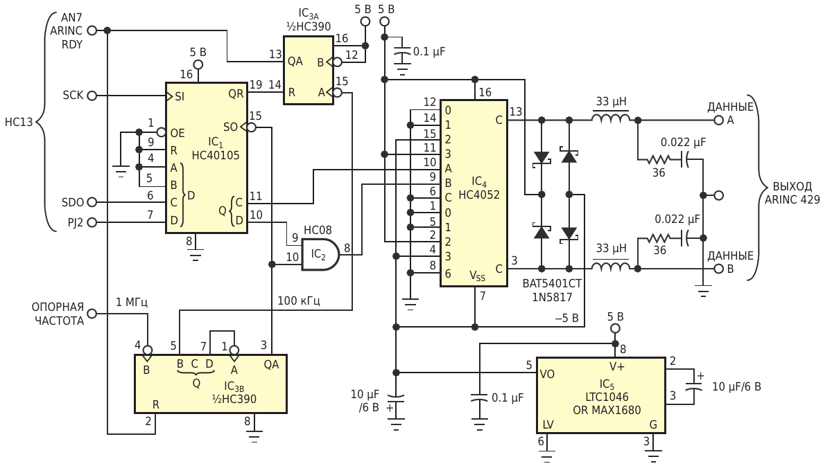 Этот передатчик ARINC 429 работает от одного источника питания 5 В и удовлетворяет всем требованиям синхронизации стандарта 429