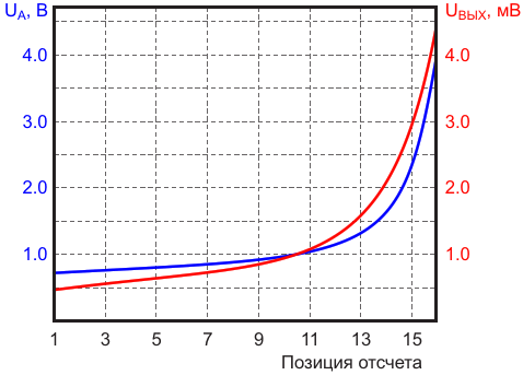 Изменение постоянного напряжения на резисторе R13 цифрового потенциометра (синяя линия) и уровня выходного напряжения (красная линия) при входном напряжении 10 мВ, 1 кГц, в зависимости от позиции отсчета (1-16)
