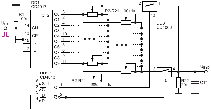 Рисунок 1. Электрическая схема формирователя периодических функций электрических сигналов произвольной формы по 20 точкам
