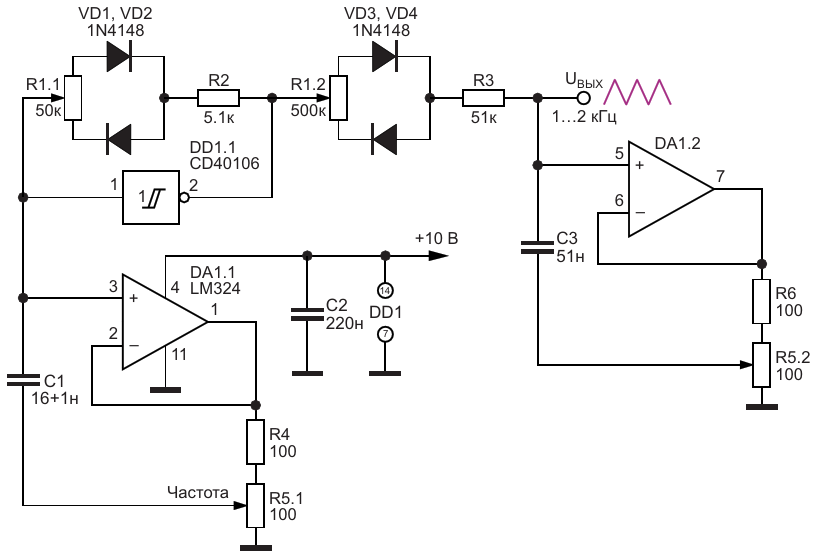 Рисунок 2. Вариант генератора линейно изменяющегося напряжения регулируемой частоты и времени нарастания-спада импульса