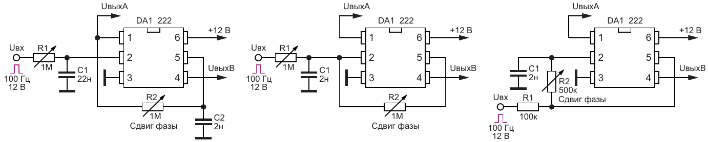 Рисунок 2. Регулируемые фазовращатели цифровых сигналов на микросхеме 222 с внешними источниками сигналов