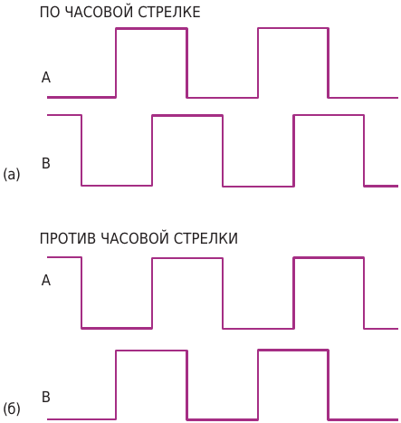 Рисунок 2. При вращении по часовой стрелке сигнал B опережает A (а); при вращении против часовой стрелки A опережает B (б)