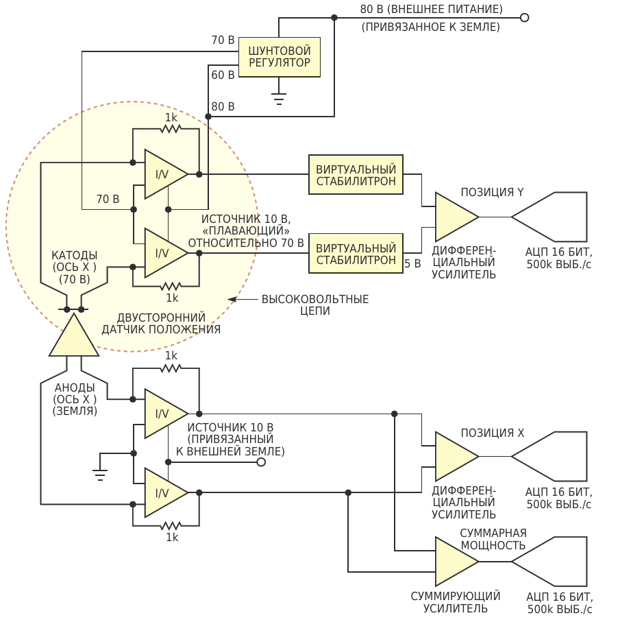 Схемы «виртуального стабилитрона» упрощают высоковольтный интерфейс в этой системе определения положения. (I/U - преобразователь ток/напряжение)