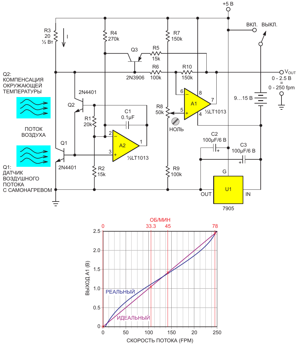 Рисунок 2. Линеаризованный тепловой анемометр низких скоростей с батарейным питанием