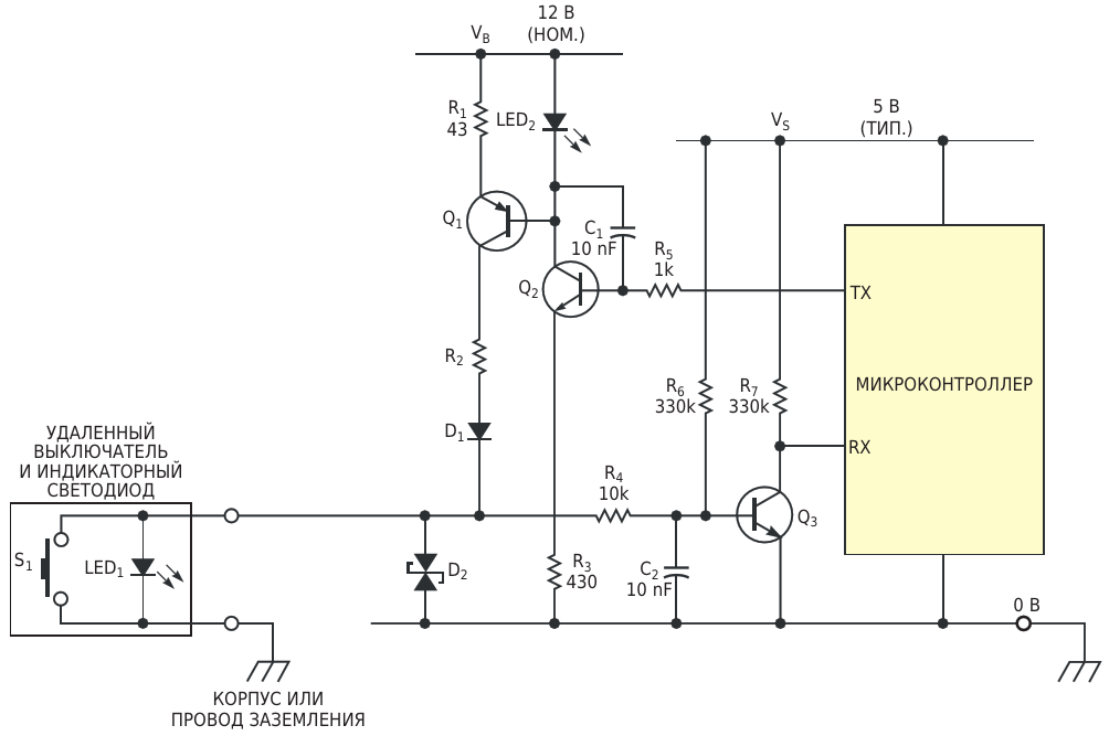 Эта схема реализует двунаправленную линию связи с использованием одного провода и канала возврата тока