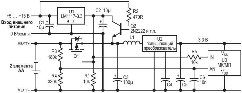 Рисунок 1. Предварительная стабилизация напряжения внешнего источника питания сочетается с последовательным подключением батареи, практически не добавляющим потерь, что максимально увеличивает срок ее службы