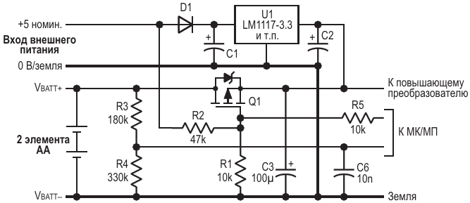 Рисунок 1. Предварительная стабилизация напряжения внешнего источника питания сочетается с последовательным подключением батареи, практически не добавляющим потерь, что максимально увеличивает срок ее службы