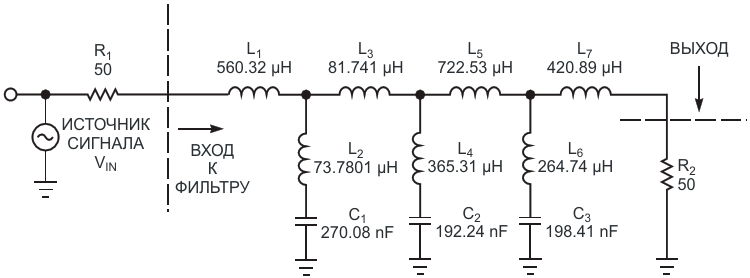 Рисунок 1. Этот прототип пассивного эллиптического фильтра нижних частот седьмого порядка имеет частоту среза 15 кГц и затухание в полосе подавления более 50 дБ