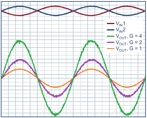 Рисунок 2. Характеристики простого усилителя-преобразователя дифференциального сигнала в несимметричный