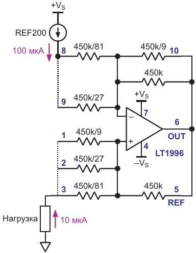 LT1996 используется в качестве программируемого источника втекающего/ вытекающего тока; в данном случае опорный ток делится на 10