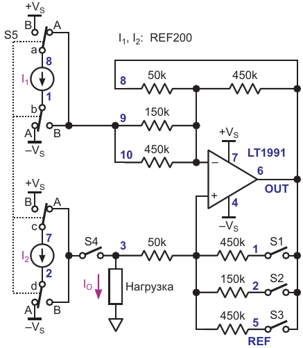 Микросхема LT1991 может использоваться для получения втекающего/вытекающего тока от 10 до 90 мкА с шагом 10 мкА