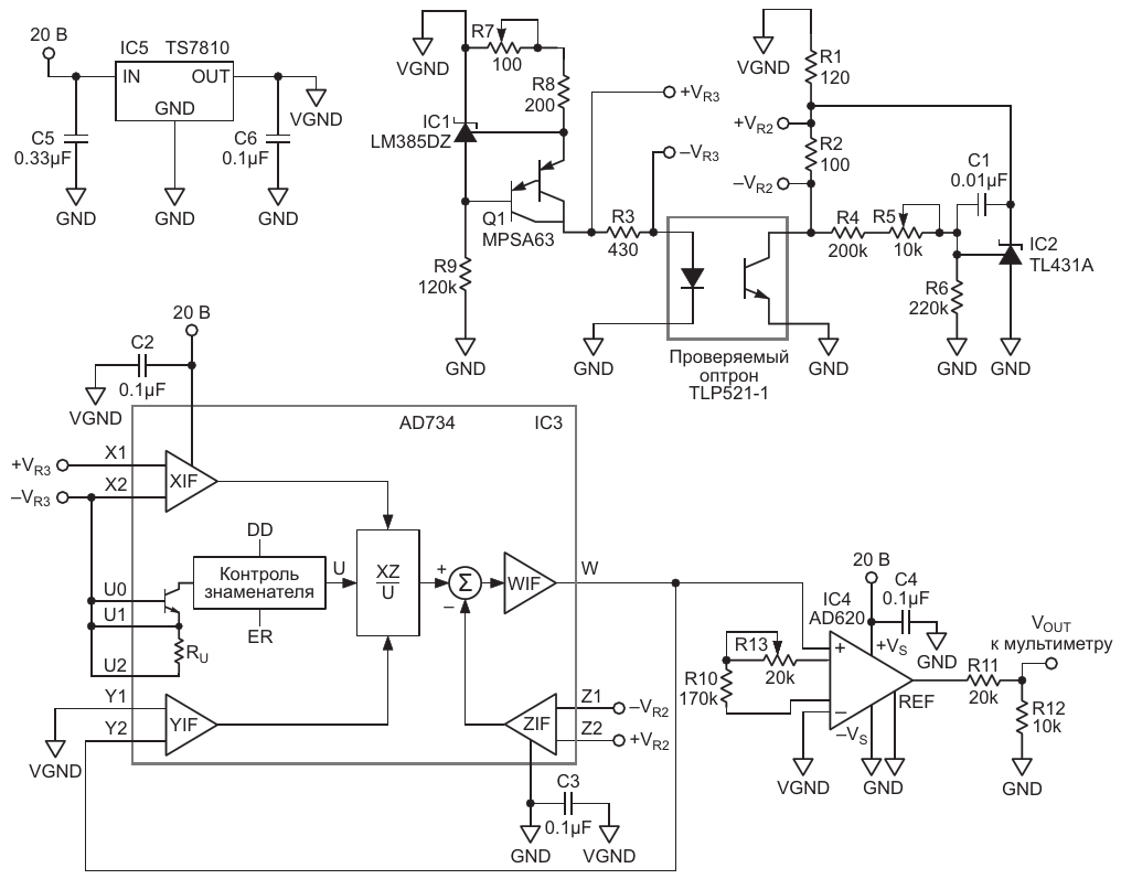 Эта схема позволяет напрямую считывать CTR тестируемого устройства с помощью мультиметра, подключенного к выходу V