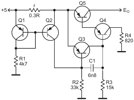 Пара транзисторов Q1, Q2 обеспечивает термокомпенсированный контроль падения напряжения на резисторе r; когда это падение возрастает примерно до 20 мВ, предохранитель «включается», ограничивая выходной ток примерно на уровне 150 мА