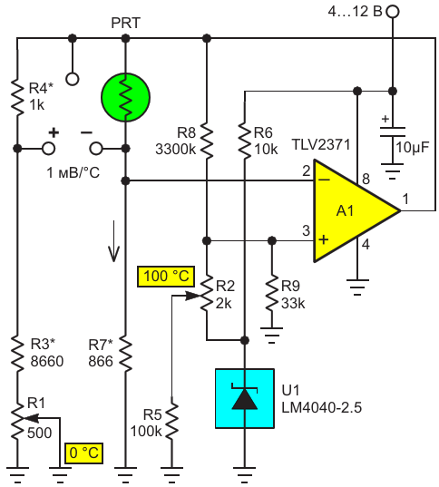 Рисунок 3. 40 мВ положительной обратной связи, подаваемые через резистор R8 к источнику опорного напряжения U1, увеличивают ток возбуждения PRT с ростом температуры и, таким образом, линеаризуют показания температуры, обеспечивая точность термометра до ±0.1 &