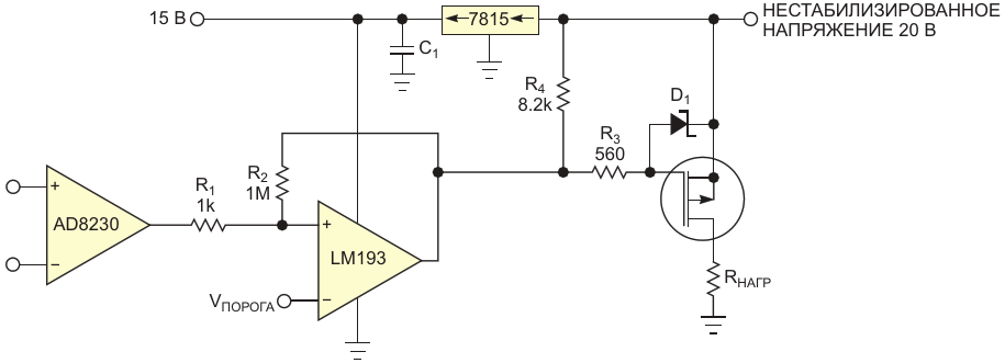 Рисунок 1. Компоненты гистерезиса R1 и R2 подключены к нестабилизированному источнику питания, в результате чего порог переключения компаратора меняется в зависимости от напряжения питания