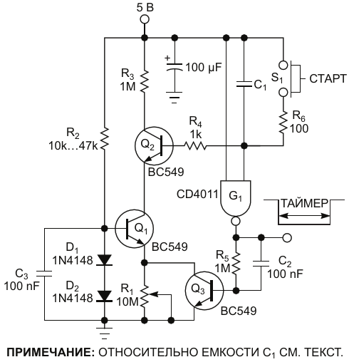 КМОП логический элемент увеличивает выдержку таймера на RC-компонентах