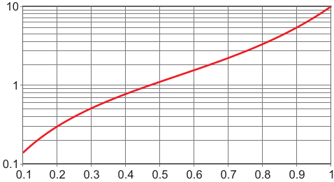 Рисунок 4. Зависимость коэффициента заполнения D (ось X) от выходного напряжения VOUT (ось Y) (достаточно) близка к логарифмической функции, что позволяет эффективно использовать ограниченное 8-битное разрешение ШИМ