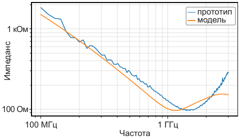 Сравнение результата моделирования входного импеданса в openEMS с измерениями в прототипе