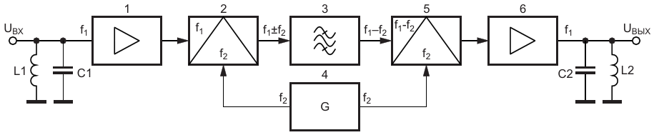 Рисунок 1. Узкополосный ВЧ-фильтр с обратимым переносом полосы частот: 1, 6 - каскады усиления; 2,5 - смесители; 3 - полосовой фильтр; 4 - гетеродин