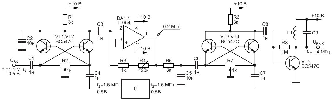 Рисунок 3. Электрическая схема ВЧ-фильтра с использованием балансных модуляторов на транзисторах