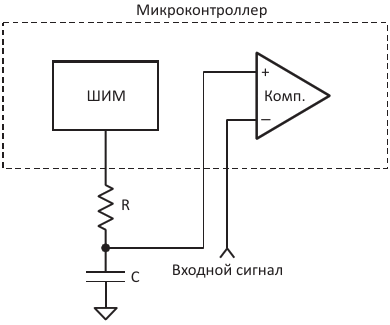 Рисунок 1. Основная концепция схемы, в которой для создания АЦП используется микроконтроллер со встроенным ШИМ и компаратором, а также RC-фильтр