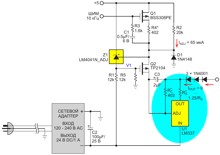 Программируемый ШИМ источник отрицательного тока 18 В/1 А с заземленной нагрузкой на основе новой топологии включения микросхемы LM337. Благодаря этой топологии точность не зависит от отклонения напряжения шины питания. Резисторы, отмеченные звездочкой, и