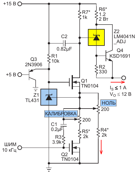 = D ампер, где D - коэффициент заполнения ШИМ. Резисторы, отмеченные звездочкой, должны иметь точность 1% или лучше