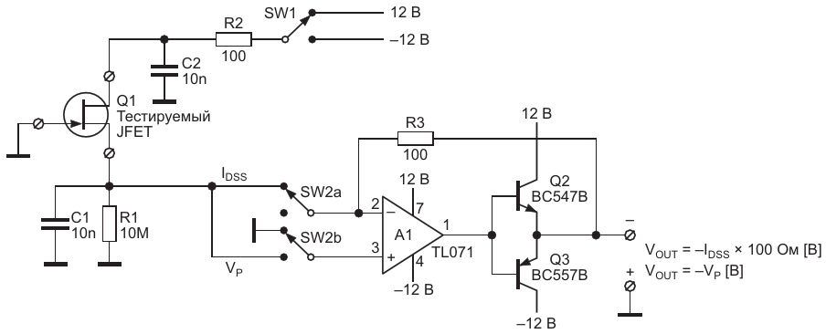 Рисунок 4. Схема с диапазоном измерений, подходящим для большинства JFET