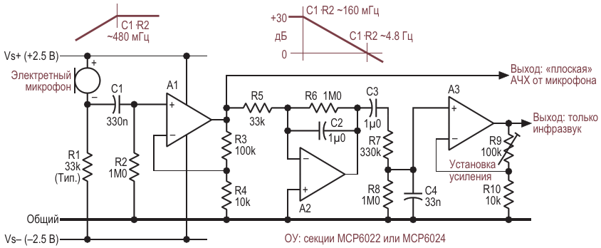 Рисунок 1. Простой эквалайзер может расширить низкочастотный отклик электретного микрофона до значений значительно ниже 1 Гц