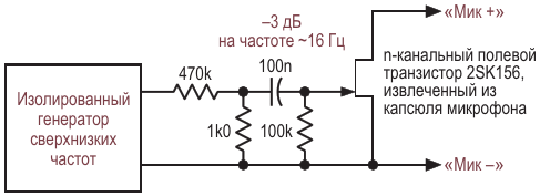 Рисунок 1. Простой эквалайзер может расширить низкочастотный отклик электретного микрофона до значений значительно ниже 1 Гц