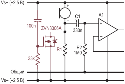 Рисунок 5. Несколько миллисекунд повышенного напряжения, приложенного к микрофону при запуске, инжектируют заряд, достаточный чтобы компенсировать бóльшую часть долговременного начального дрейфа полевого транзистора