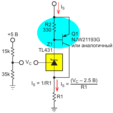 Рисунок 2. Бустерный транзистор Q1 может выдерживать ток и напряжение, превышающие максимальные значения, допустимые для микросхемы 431, а делитель напряжения 3.5 В программирует постоянный ток IS