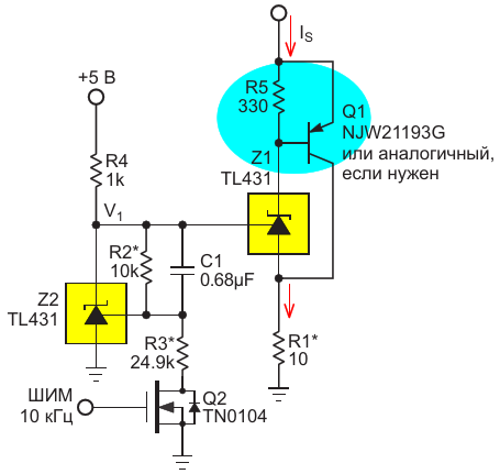 Рисунок 2. Бустерный транзистор Q1 может выдерживать ток и напряжение, превышающие максимальные значения, допустимые для микросхемы 431, а делитель напряжения 3.5 В программирует постоянный ток I