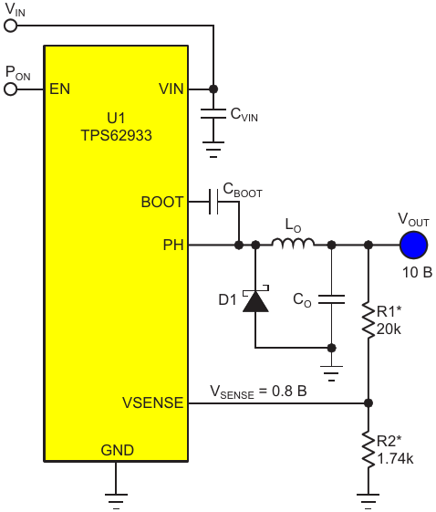 Рисунок 1. Типичная схема программирования выходного напряжения регулятора, в которой напряжение узла обратной связи VSENSE и значение сопротивления R1 различаются в зависимости от типа