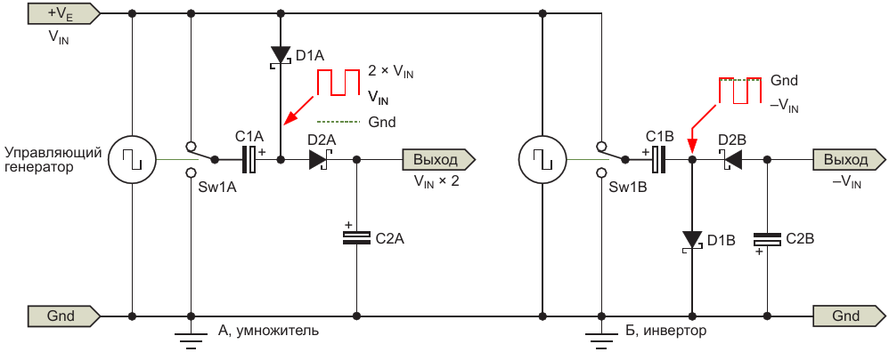 Рисунок 1. Принципы работы умножителя (А) и инвертора (Б)