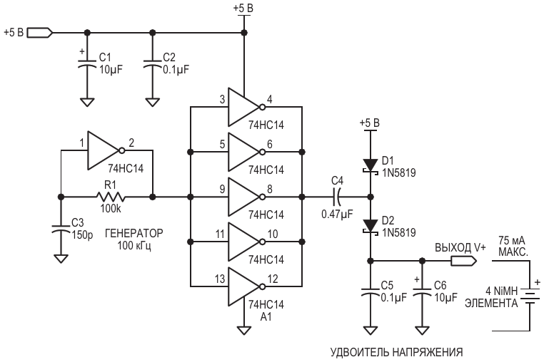 Устройство зарядки аккумуляторов на основе зарядового насоса с питанием от +5 В