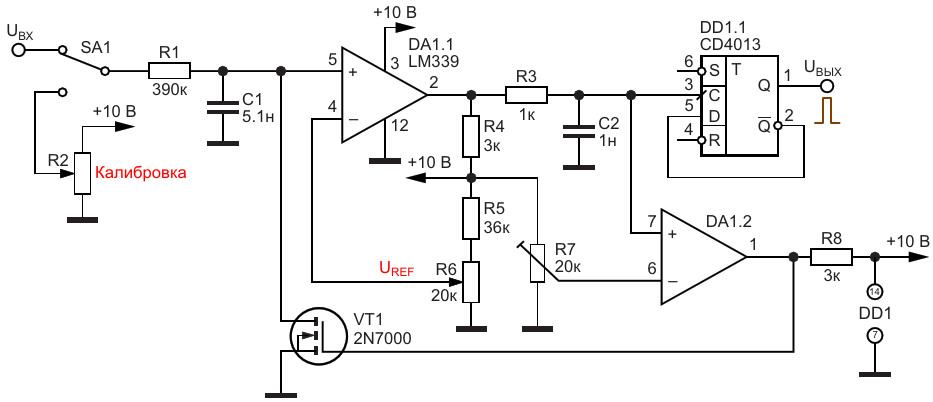 Рисунок 3. Электрическая схема линейного преобразователя величины входного напряжения в пропорциональное изменение частоты выходных прямоугольных импульсов