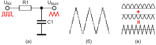 Рисунок 1. Способы получения сигналов треугольной формы за счёт: а) периодического заряда и разряда конденсатора C1 через резистор R1 от генератора прямоугольных импульсов; б) ступенчатого синтеза сигнала; в) сложения двух разнополярных выпрямленных сигналов исходно
