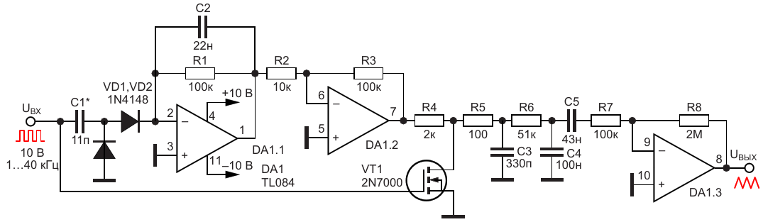 Рисунок 4. Электрическая схема преобразователя прямоугольных импульсов в треугольные с сохранением их амплитуды при изменении частоты входного сигнала от 1 до 40 кГц