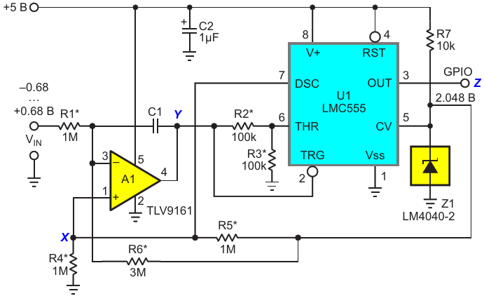 Операционный усилитель A1 непрерывно интегрирует входящий сигнал VIN, тем самым минимизируя шумы. Преобразование происходит в чередующихся фазах T- и T+. Отношение длительностей фаз T-/T+ не зависит от постоянной времени RC, поэтому нечувствите